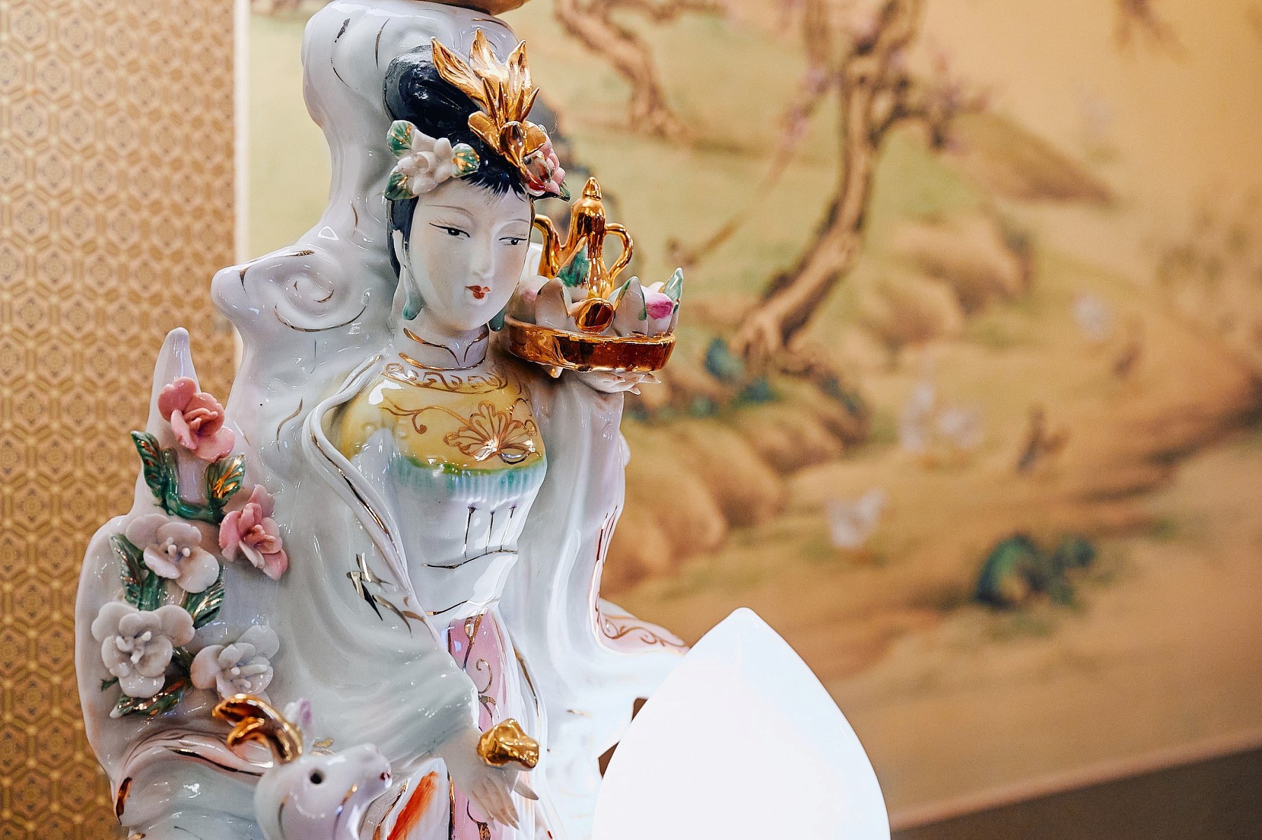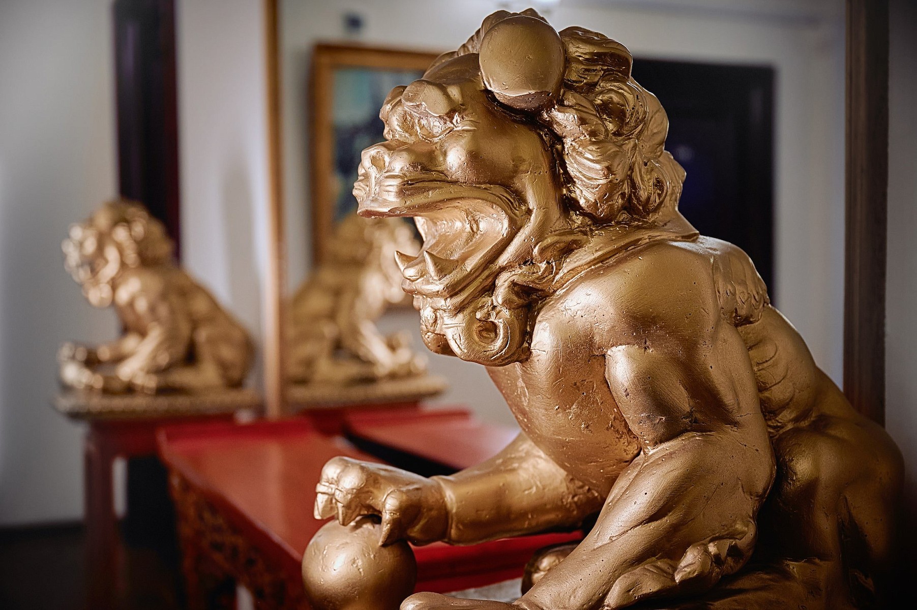 И только спустя много лет стражники появились перед дворцами, храмами и государственными учреждениями. Со временем львы стали украшать дома и превратились в символ высокого социального положения и материального благополучия семьи. Традиционно львы-стражи, удерживая лапой бронзовый шар, располагаются парой по обеим сторонам входа. По правую руку лев, по левую — львица. По поводу того, что именно символизирует шар, существует несколько легенд. По одной из них лев прижимает лапой «земной шар» и олицетворяет энергию Янь. По другой – мяч — это солнце, а лев – символ силы природы.