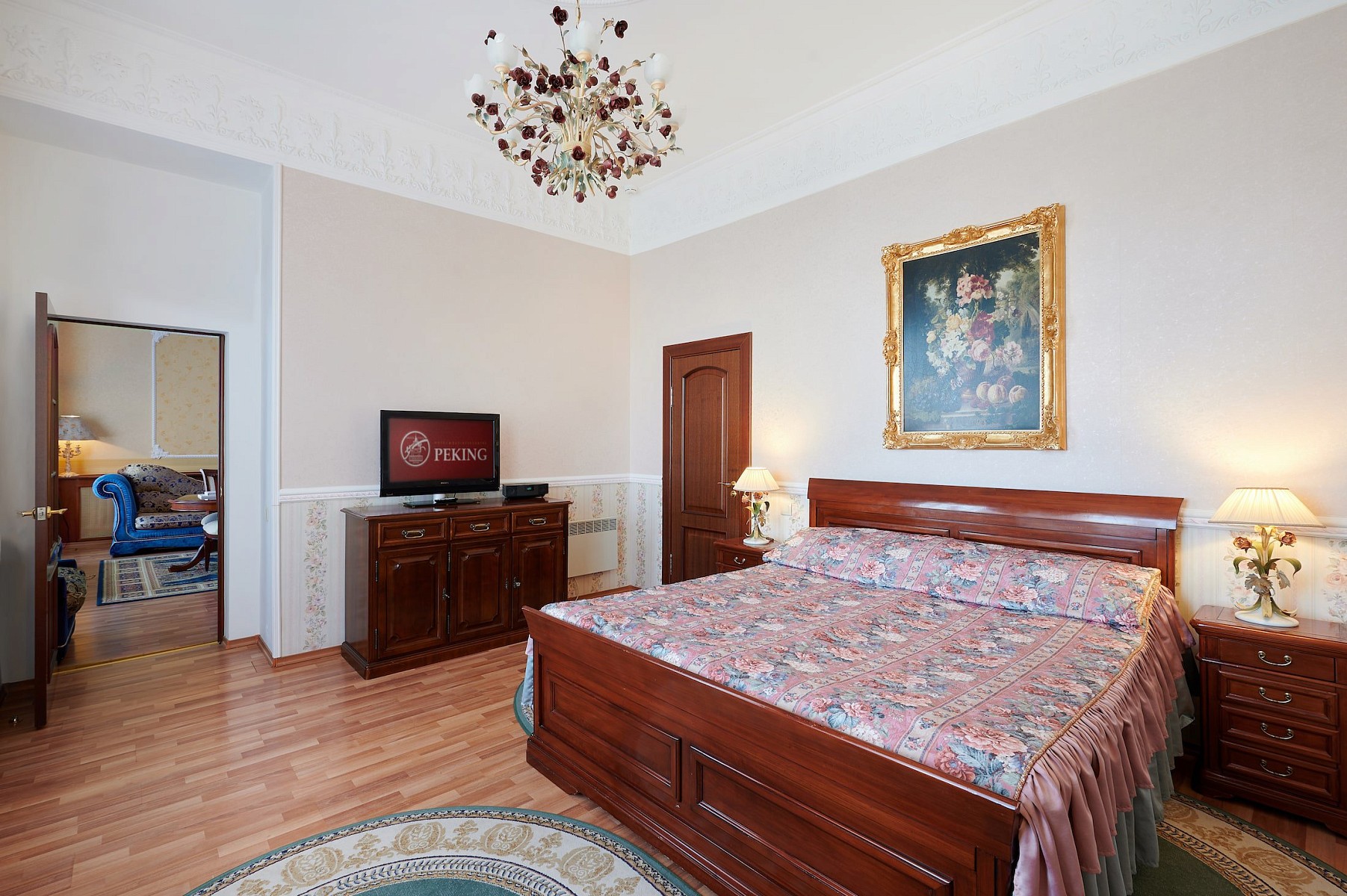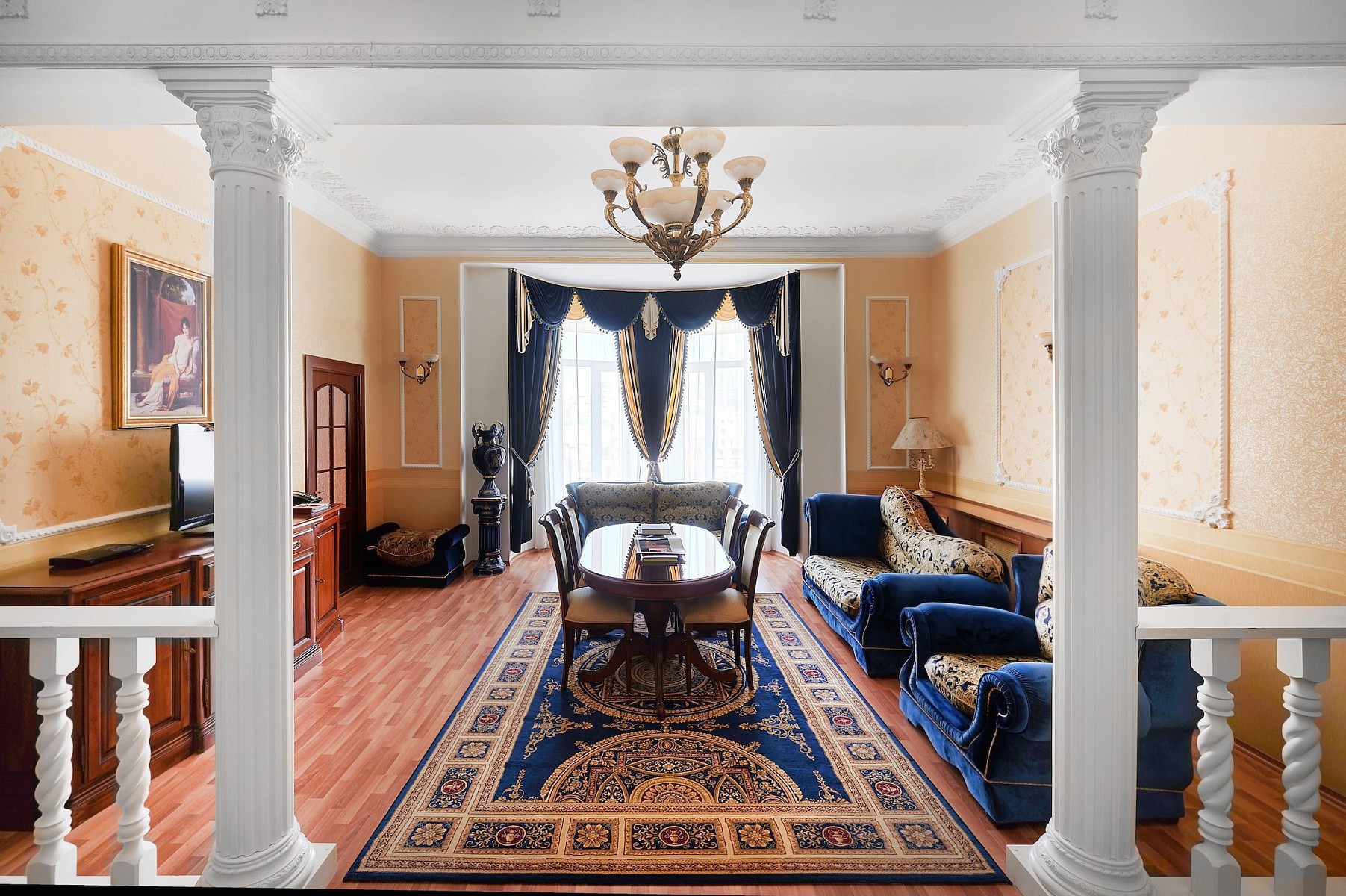 Люкс Премиум площадью 63 м2 - элегантный номер в стиле сталинского ампира, состоящий из двух комнат: спальни и гостиной с панорамными окнами.